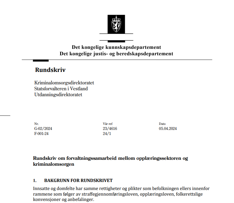 Invitasjon til dialogmøte mellom Statsforvaltaren i Vestland og fylkeskommunane/Oslo kommune om rundskriv G-nr 02/2024 - Rundskriv om forvaltningssamarbeid mellom opplæringssektoren og kriminalomsorgen.
